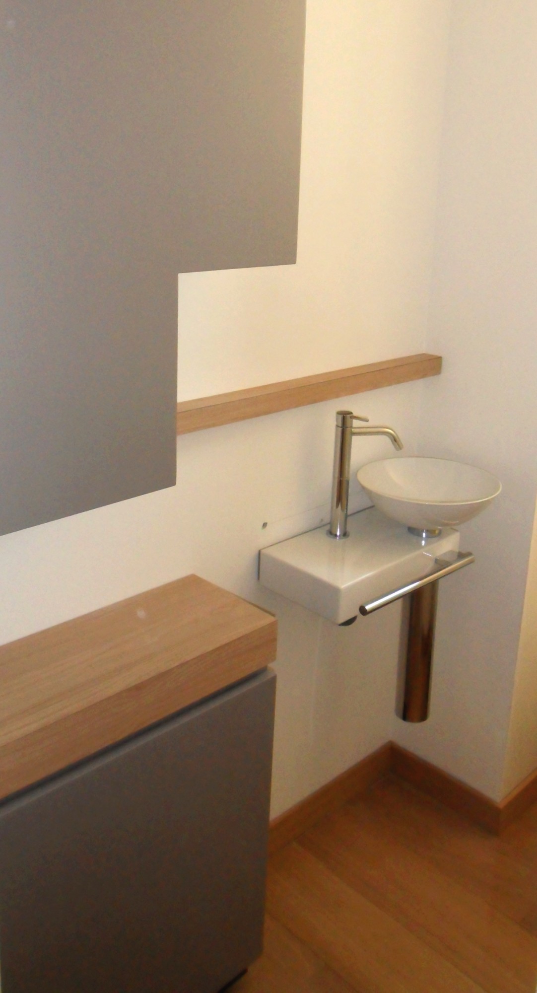Le dessus du meuble bas, en stratifié ton bois, est rappelé par une baguette au dessus du lavabo.