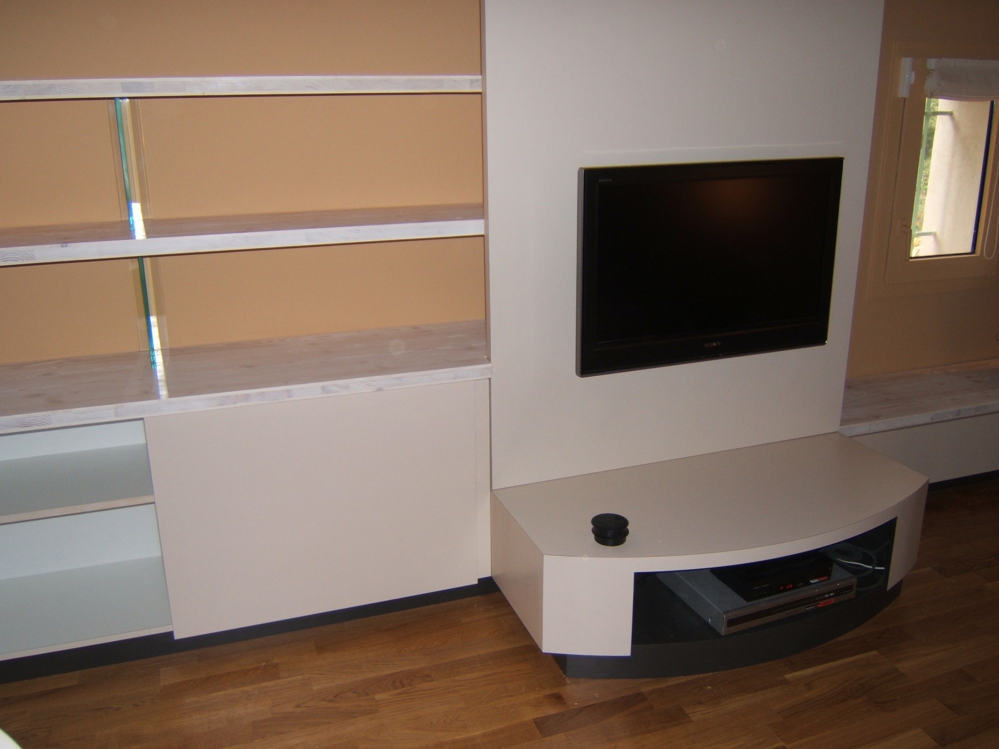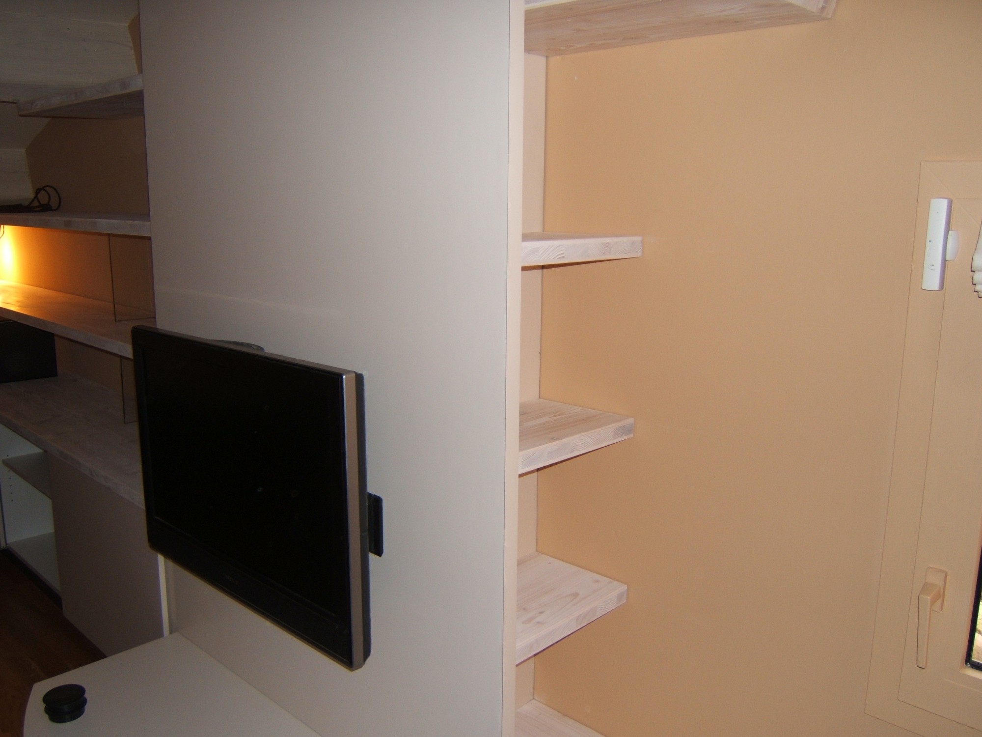 L'ensemble, sur mesure, se compose d'un bureau, d'étagères, de meuble télévision. Dans ce petit espace, MENUISERIE MD a su optimiser les rangements en conservant l'élégance à laquelle nos clients sont habitués.