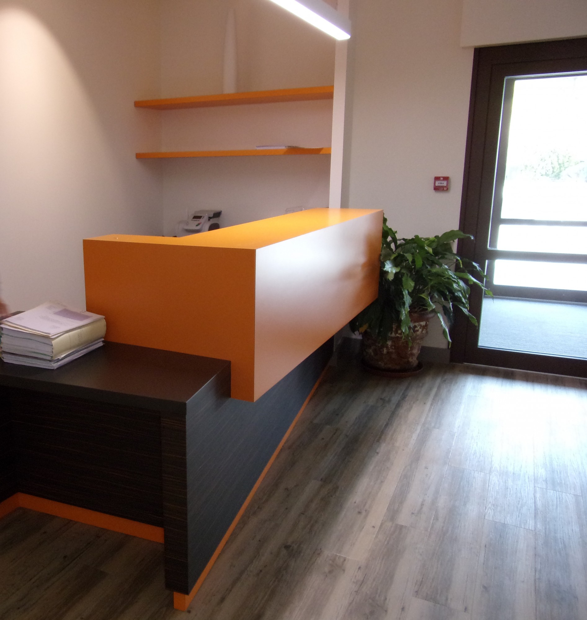 Banque d'accueil sur mesure pour cet office notarial. Elle a été fabriquée, dans notre atelier de Marseille, en stratfié Polyrey Orange et Ebène Orangé. Chaque couleur mettant l'autre en valeur.