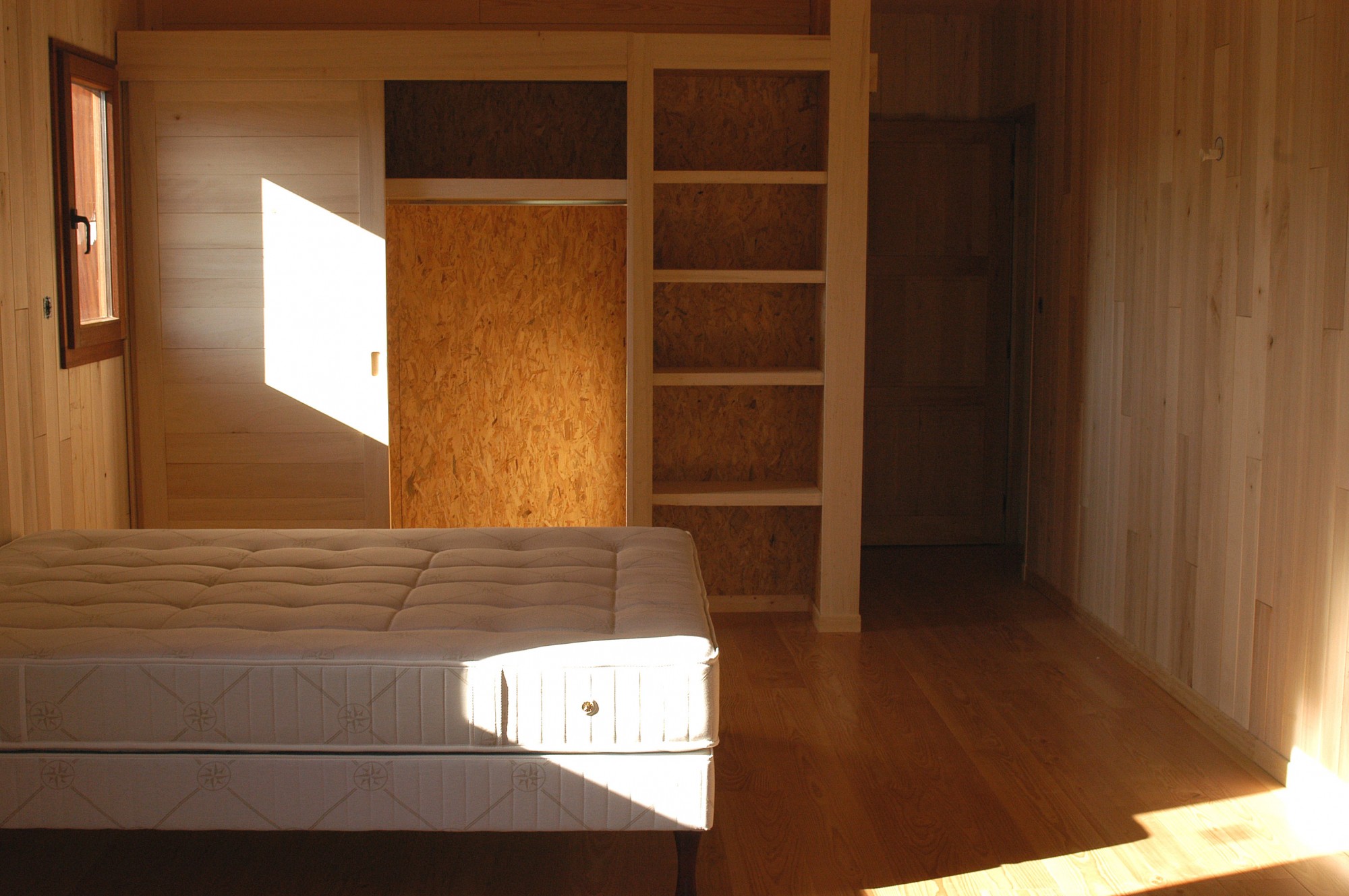 La structure, réalisée en OSB, sert également de base pour le placard coulissant. Les montants de la bibliothèque et des portes coulissantes ont été fabriqués en tilleul. Un vernis protecteur a été appliqué sur l'ensemble de la réalisation.