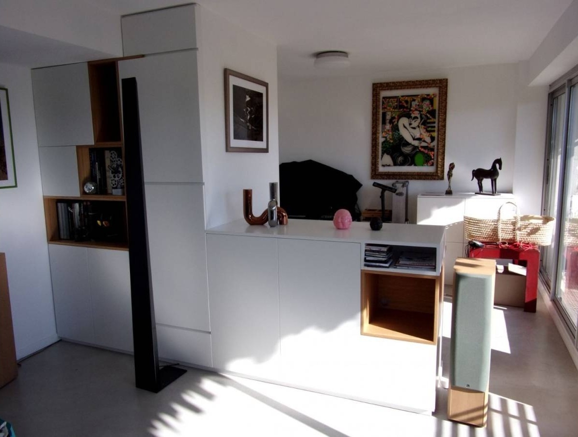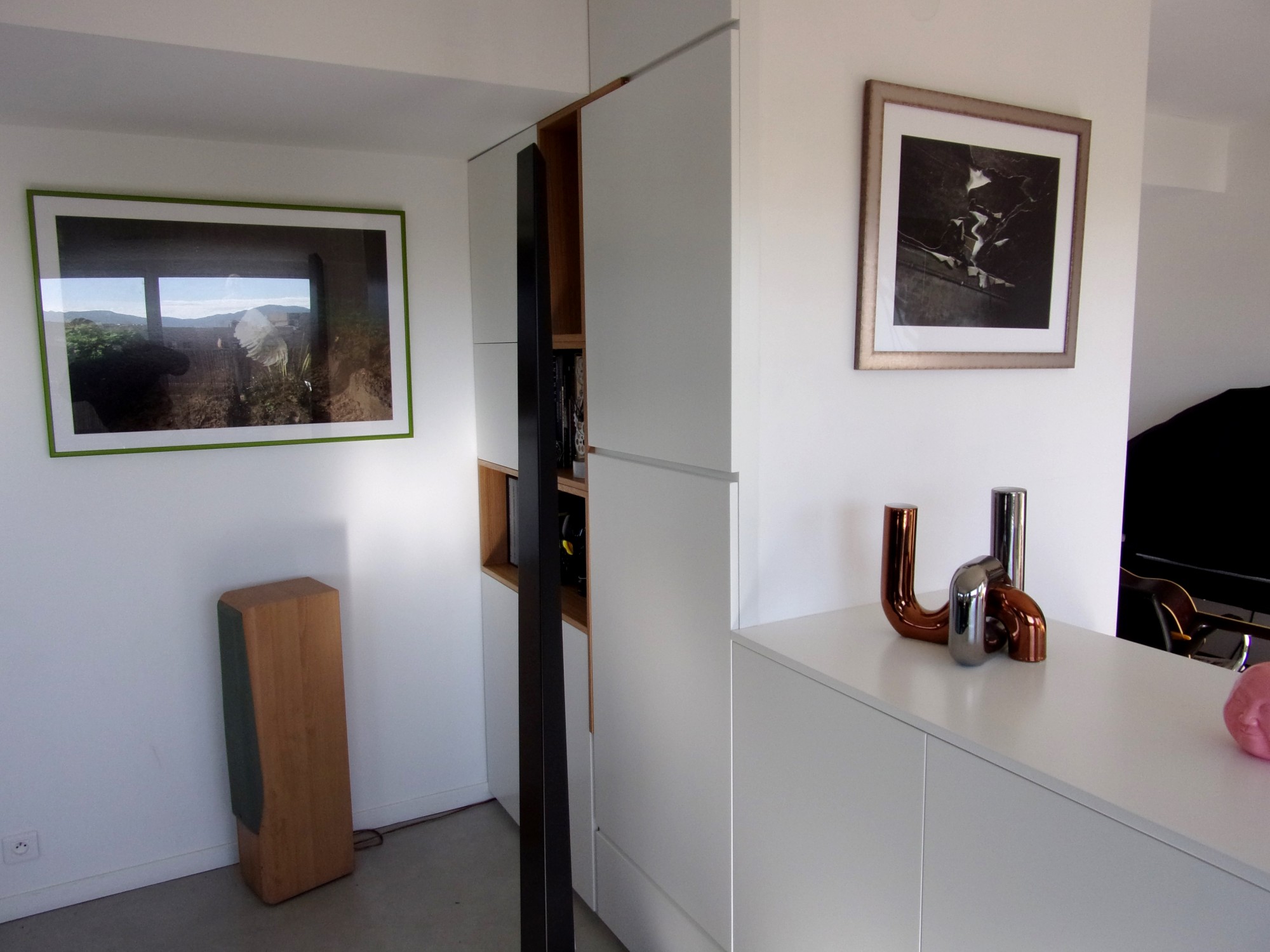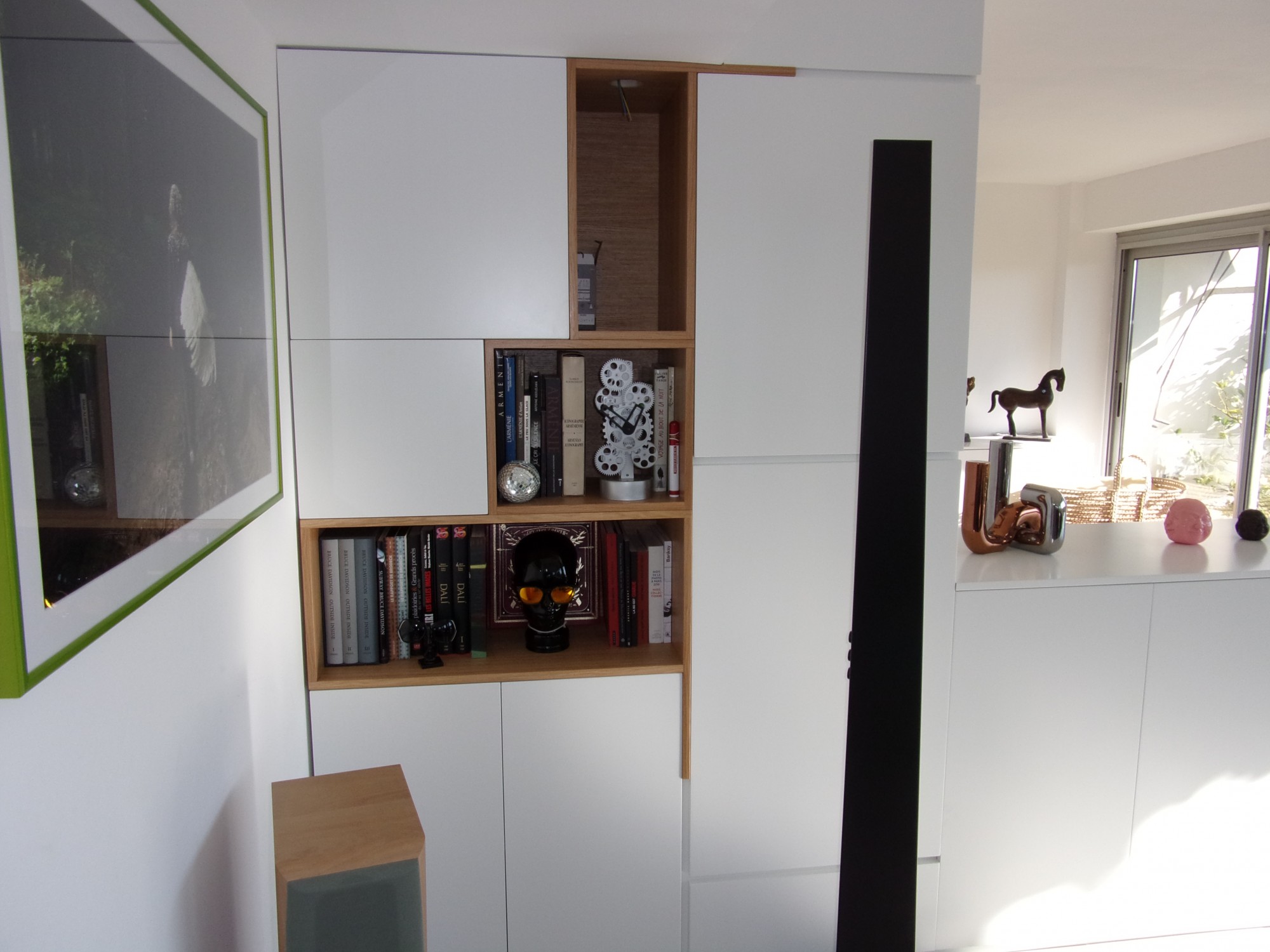 Bibliothèque blanche, laquée, avec quelques petites touches de bois pour lui donner un coté chaleureux. Cette bibliothèque fait également office de meuble télé : il suffit d'ouvrir les 2 portes du meuble de droite (charnières à 180°). Le poteau de gauche a également était habillé d'une façade laquée, blanche, pour l'harmonie de l'ensemble. Les caissons bois ont été habillés de chêne.