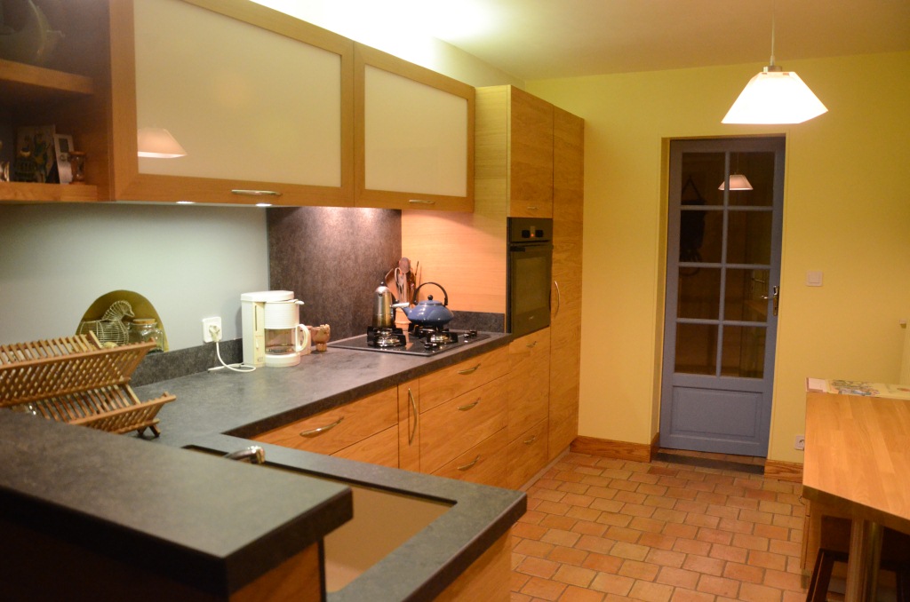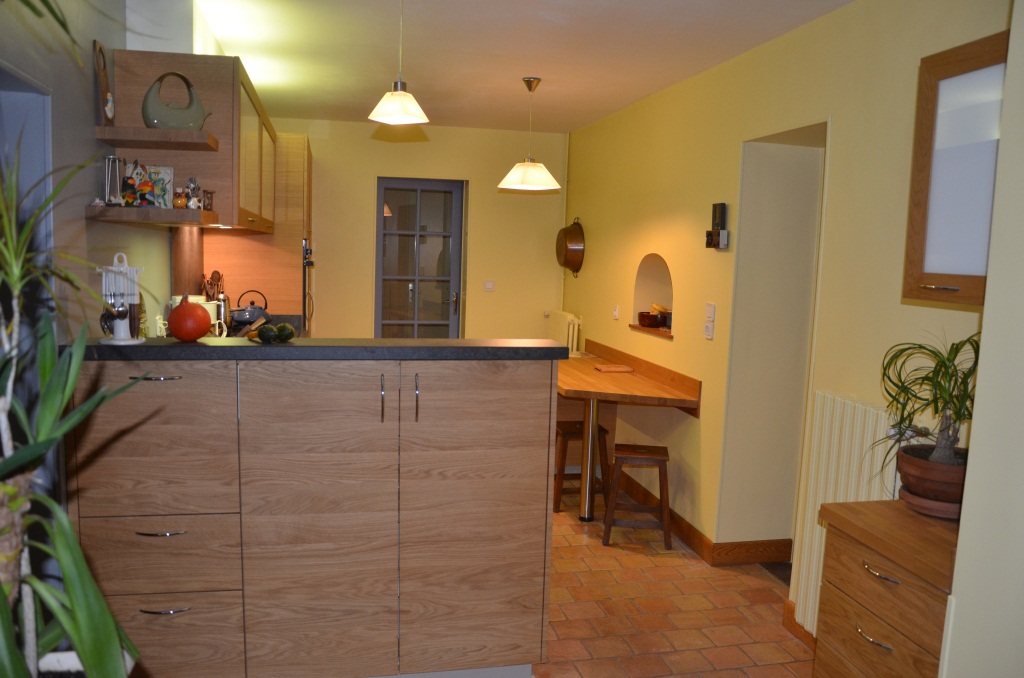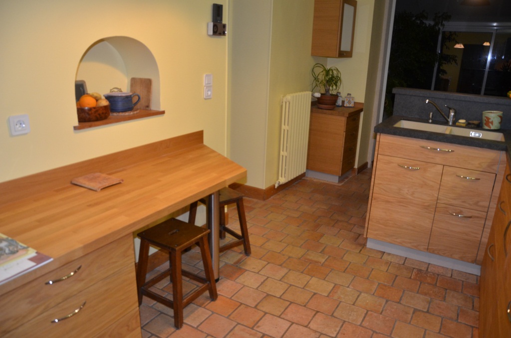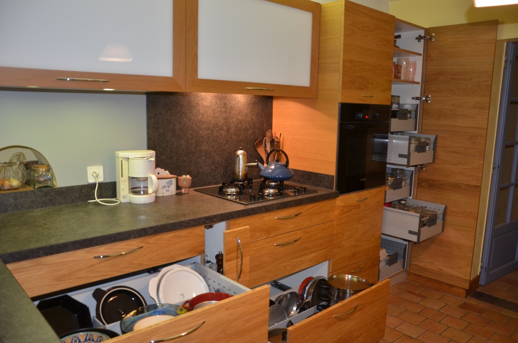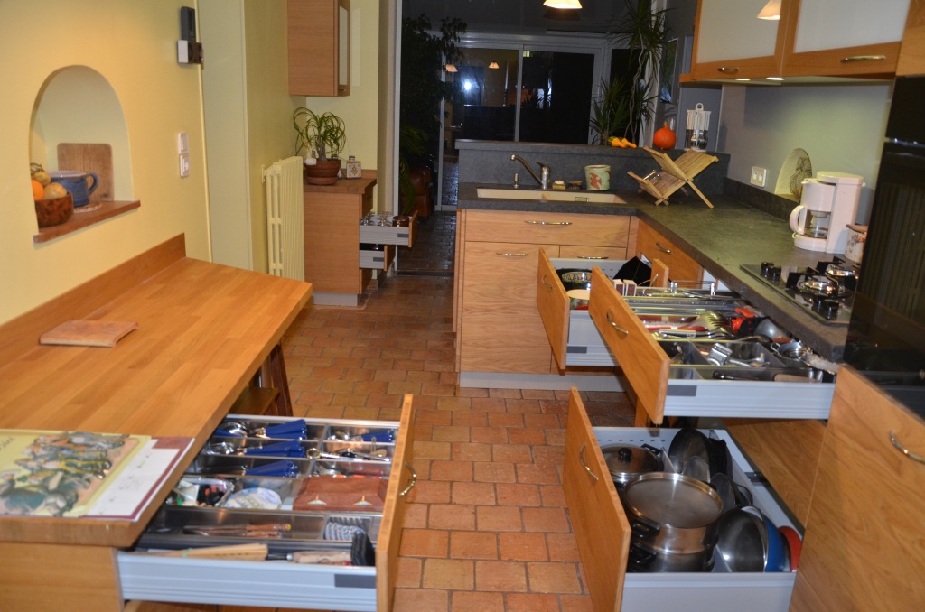 Comme souvent dans nos cuisines, les tiroirs ont été privilégiés. On en retrouvera donc dans l'armoire à provision, si chère à notre menuisier cuisiniste, ou pour la panière à provision et bien sur pour les différents rangements. Une table a été créée dans le prolongement du plan de travail situé face à la cuisine principale.