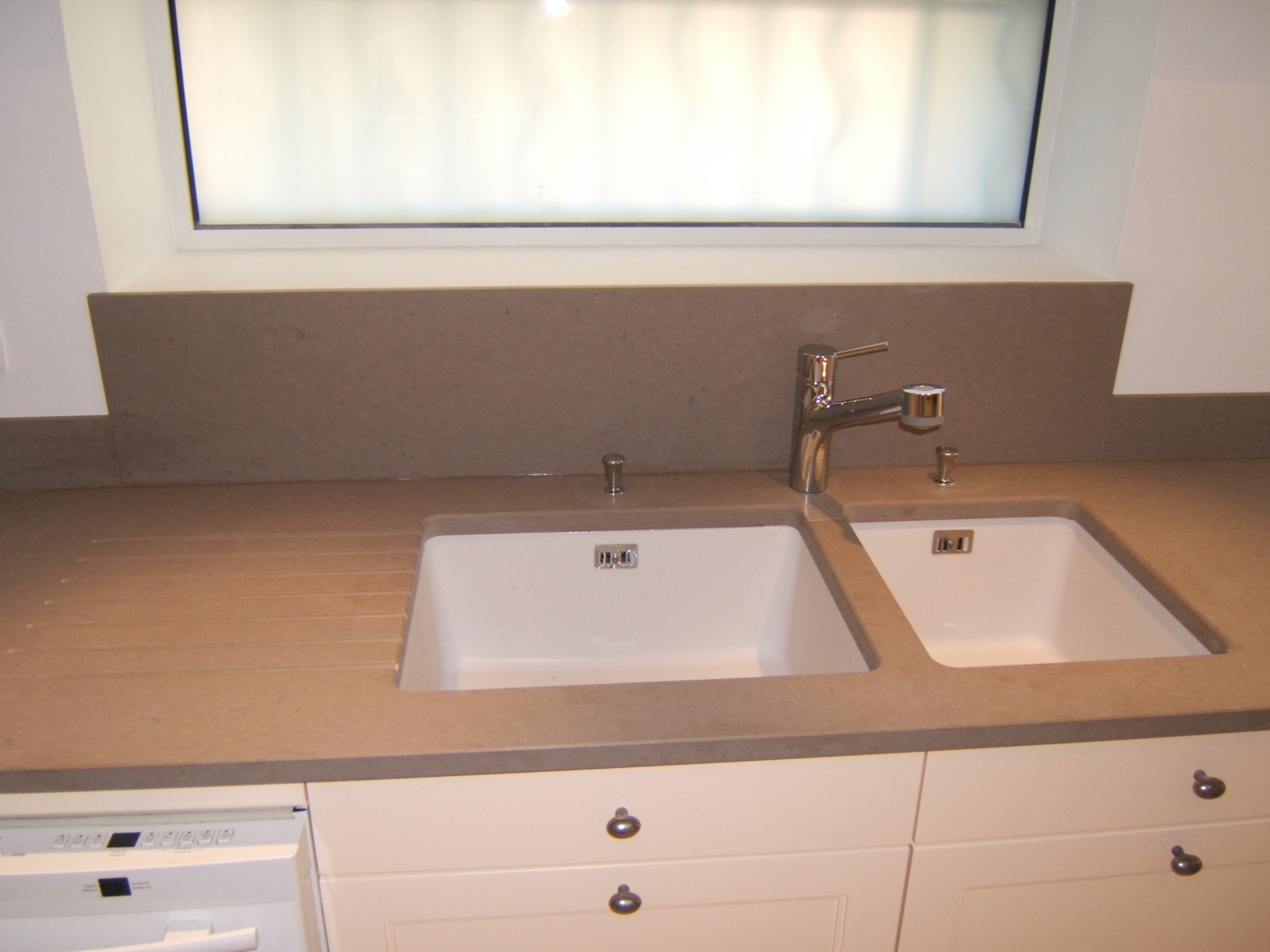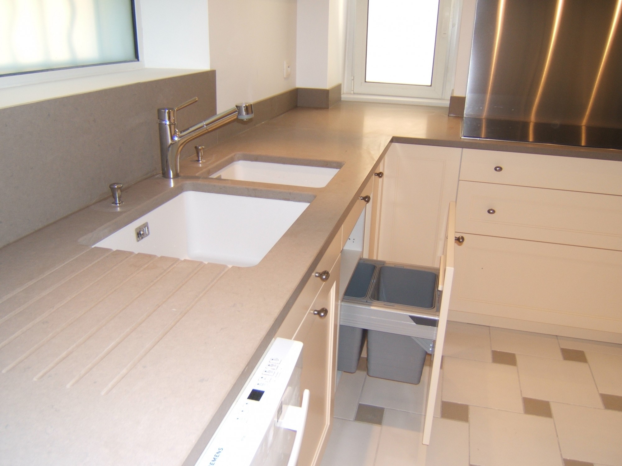 Succession de portes assemblées laquées blanches. Les plans de travail, ainsi que la crédence de l'évier sont en Pierre de Plan taupe s'harmonisant avec les carreaux de sol.