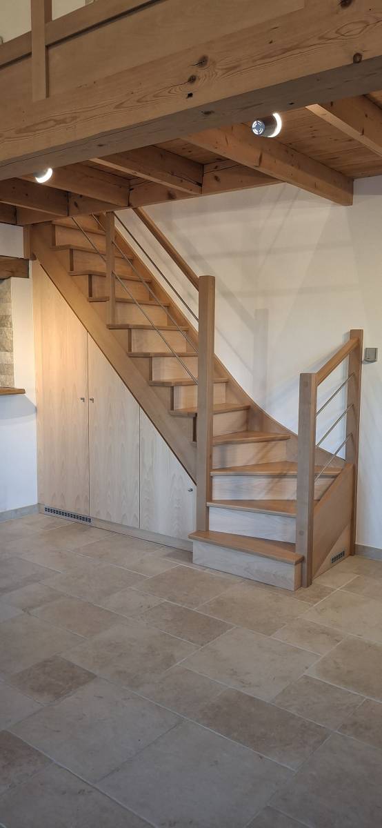 Un escalier 1/4 tournant en hêtre teinté chêne clair