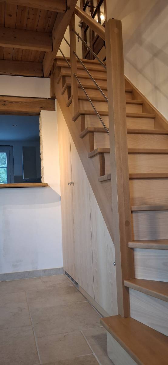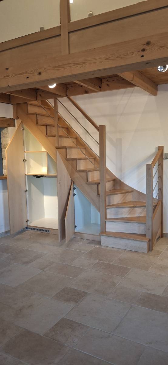 Pour optimiser l’espace, nous avons réalisé un aménagement sous escalier sur mesure, alliant rangement et esthétisme.