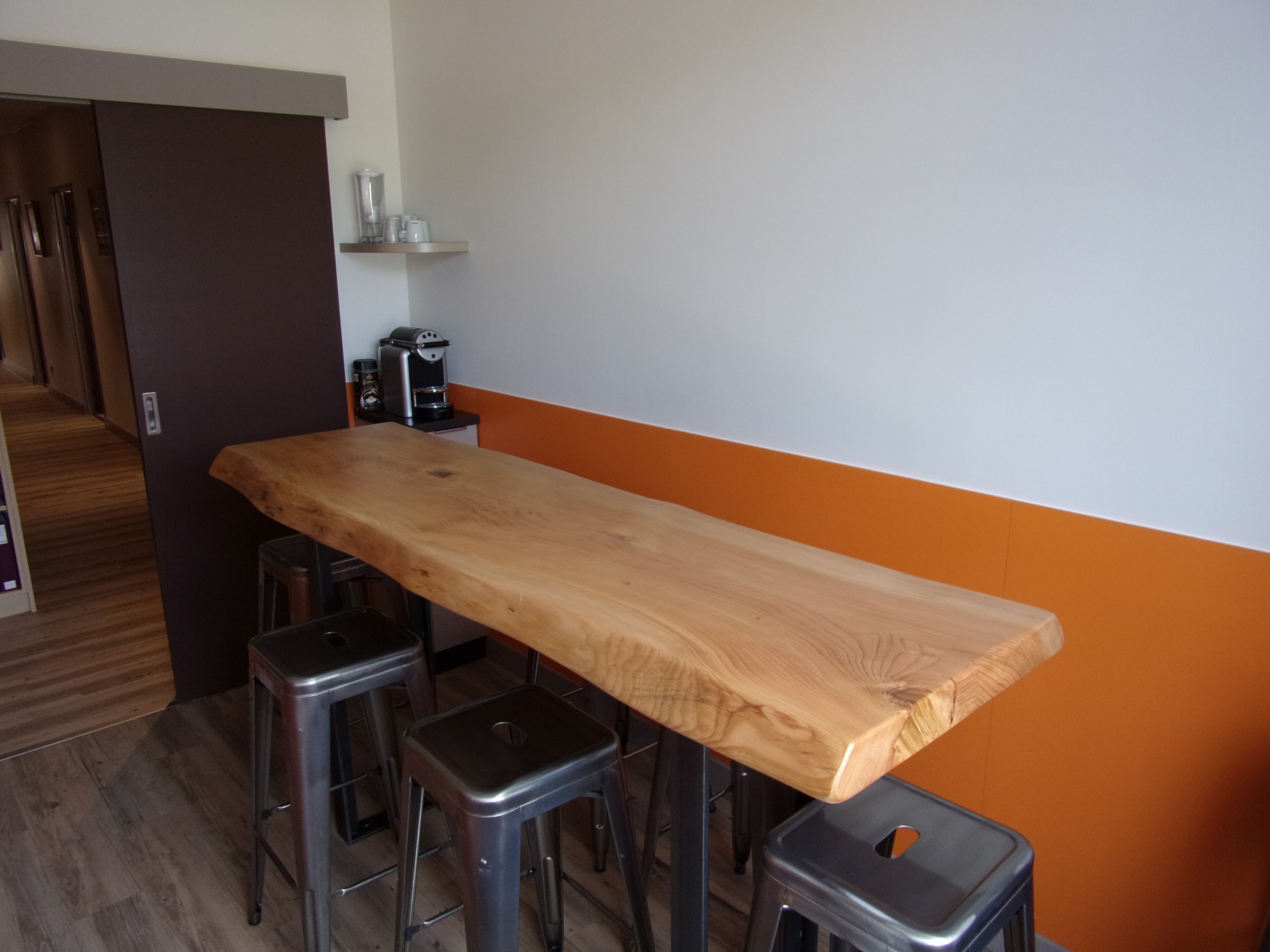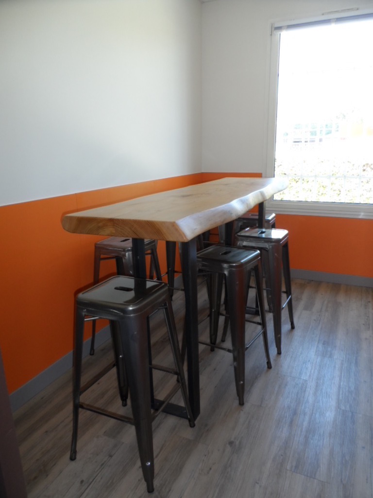L'utilisation du orange dynamise cet espace à la disposition des collaborateurs. Un plateau de cèdre a été raboté, poncé et vernis dans notre atelier de Marseille. Beaucoup d'originalité pour ce mange debout. Le piétement métal a été apporté par notre client.