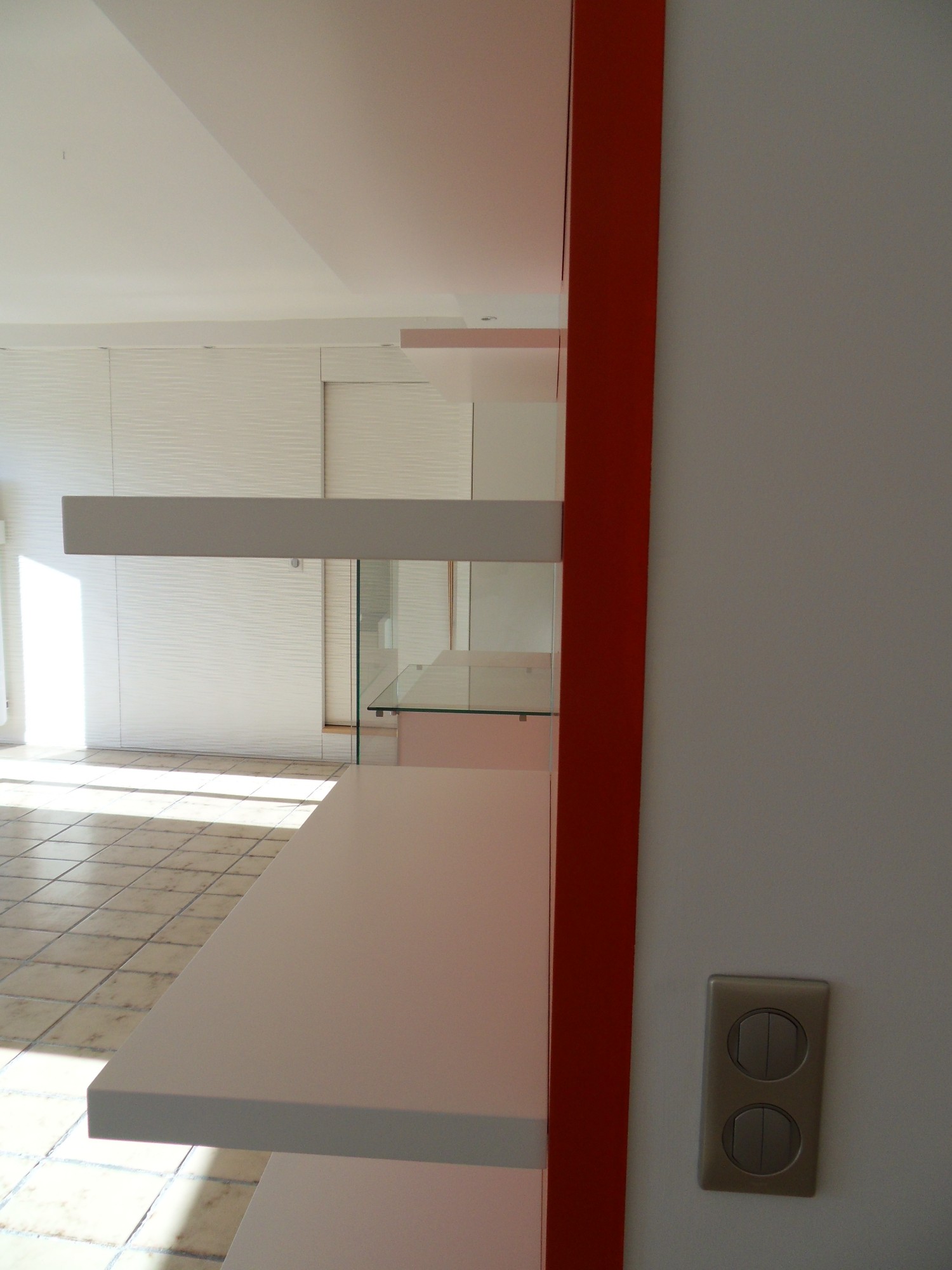 Le rouge vitaminé apporte de la gaieté et de l'originalité à ce meuble, qui sert également de cloison à la cuisine et au hall d'entrée. On peut apercevoir dans la deuxième photo, le coté du meuble.