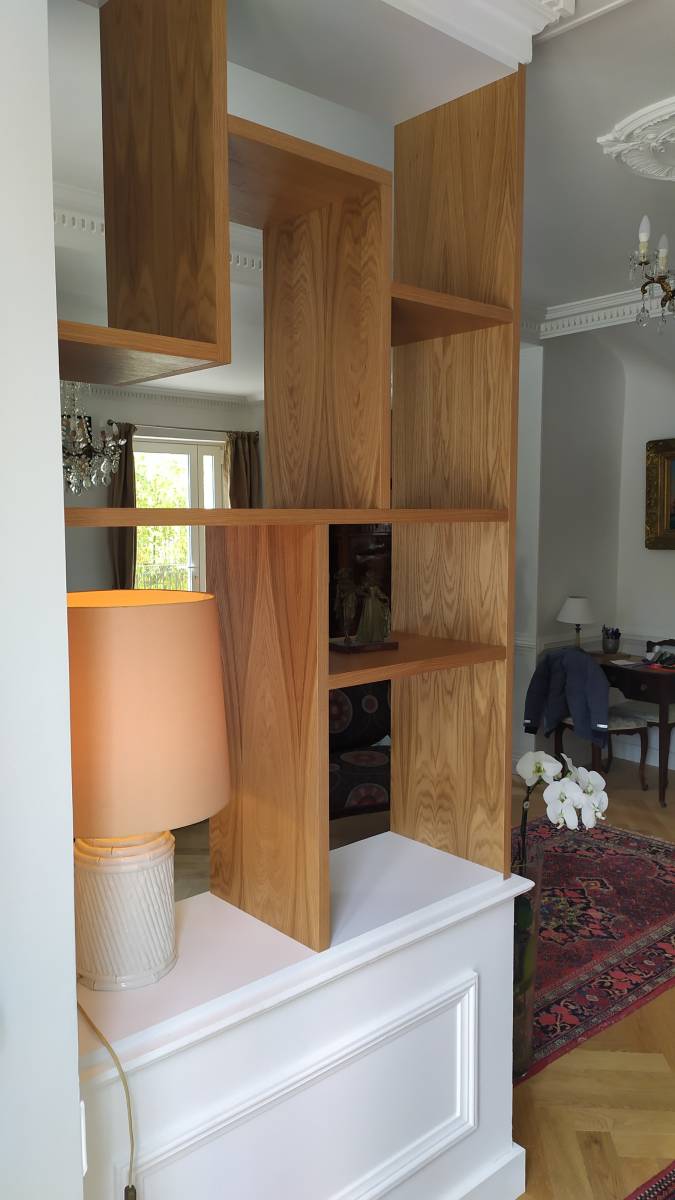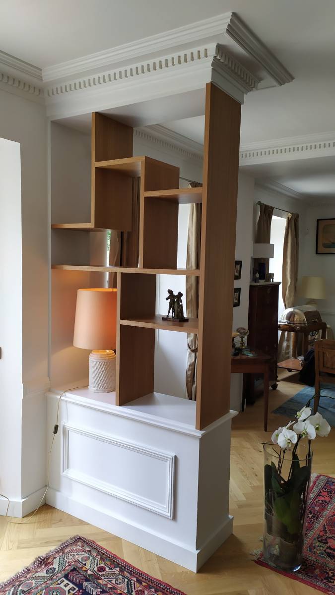 Pour se fondre dans le décor existant nous avons utilisés 2 types de panneaux : du médium à peindre en blanc et du latté chêne vernis pour garder un aspect noble se mariant parfaitement avec l’esprit de la pièce.